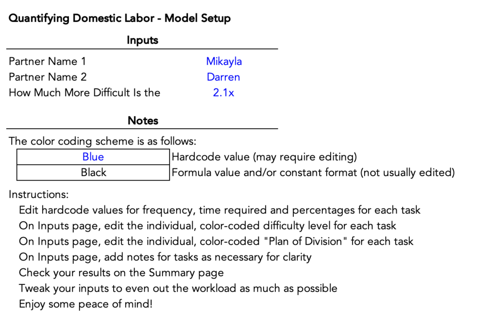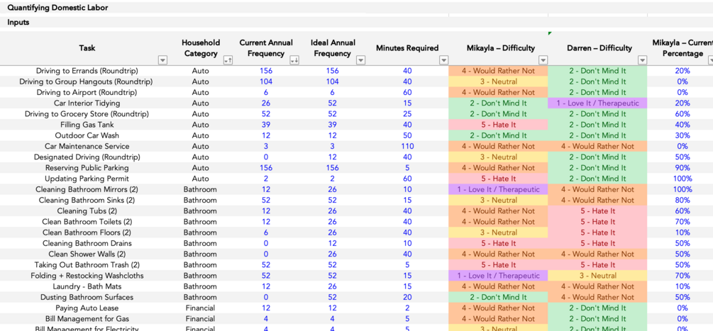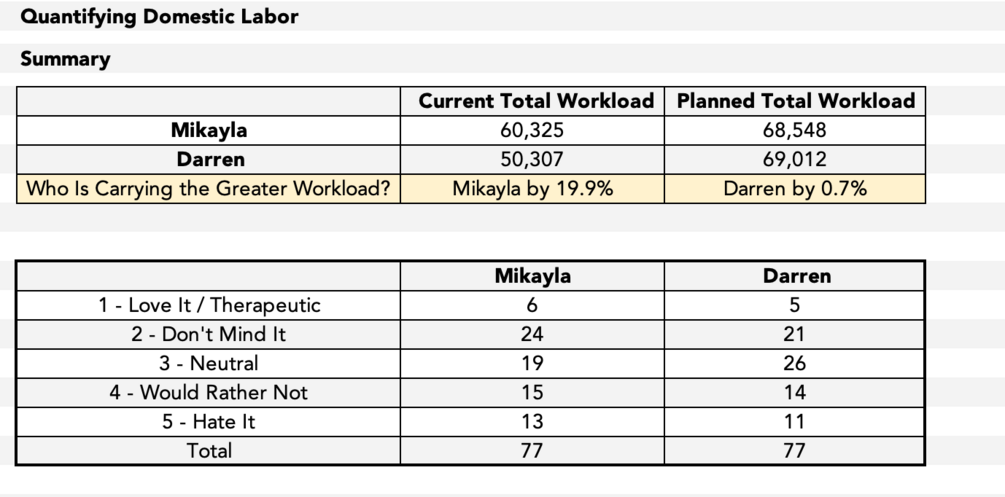 An Excel tool for couples who are trying to balance shares of domestic responsibility.
